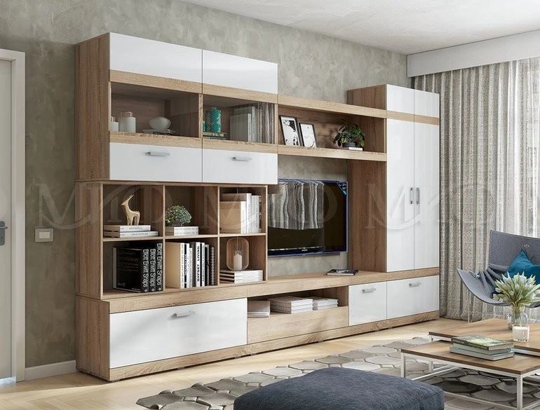 Гостиная "Авангард " - это удивительное сочетание изысканного вкуса и высокой функциональности. Воздушность белого глянца удачно подчеркивает теплый, древесный оттенок корпуса.